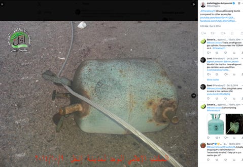 The process by which this imagined device came into existence is informative. As early as summer 2014, images of refrigerator coolant cylinders were being relayed by the Western-government linked propaganda operation Bellingcat along with online speculation as to their purpose.