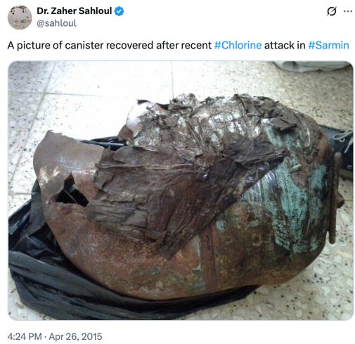 During early 2015 other significant individuals also posted or discussed images of the R22 cylinders, including Dr Zaher Sahloul from the Syrian American Medical Society and former British military officer Hamish de Bretton-Gordon. As we saw in parts two and three, Hamish was involved with an MI6 sample gathering operation back in 2013, and his CBRNe taskforce fed information to the OPCW from the 2014 alleged incident in Talmenes when we know at least one of the alleged attack sites was staged.
