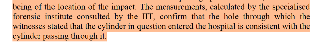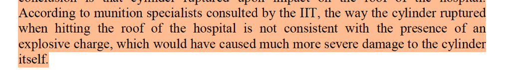 Then, having introduced munition experts who might have been expected to assess the actual compatibility between the damage seen on the cylinder and the damage to the hospital roof, the IIT evades the issue entirely by focusing on whether the size of the hole in the roof matched the cylinder, and confirming the cylinder filmed outside the hospital was the same one filmed inside the hospital. The only mention of the damage to the cylinder relates to an assessment that it was not caused by an explosive device.