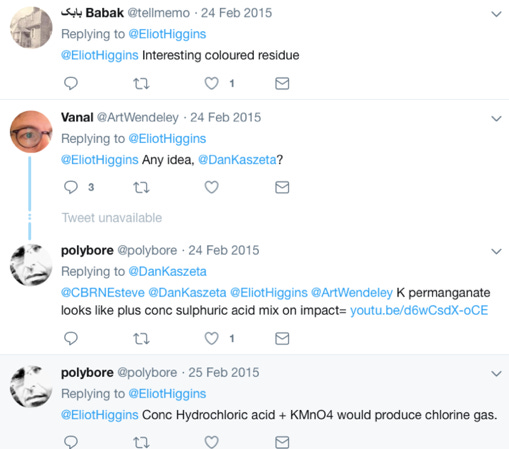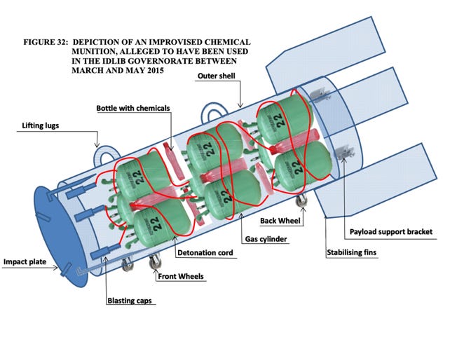 Between the 16th of March and 20th of May, and in the midst of this online narrative construction, a series of alleged attacks occurred and the OPCW FFM were asked to investigate. As can be read in the FFM report published later in 2015, the R22 cylinders and potassium permanganate were brought together in a speculative exercise, reflective of the online conversations noted above, and the world was presented with the binary chlorine device.
