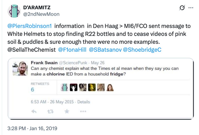 The question of the contents of the R22 cylinders also apparently had the UK’s CW expert Hamish de Bretton-Gordon confused. In an interview with the then Times journalist Deborah Haynes, Hamish declared that terrorists in the UK could simply strip cylinders off the back of household fridges and then deploy them as improvised chlorine devices.