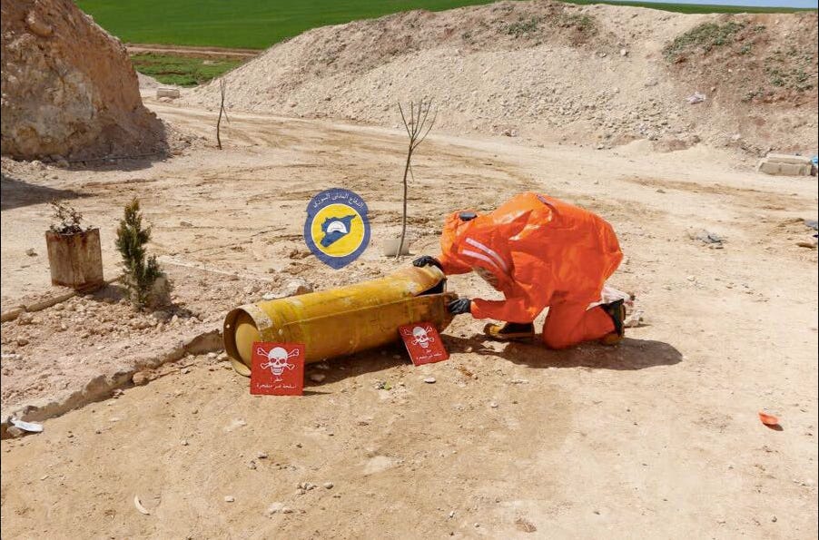 Figure 18 Image showing White Helmet attending to the ‘cave hospital’ cylinder after its removal from inside the hospital.